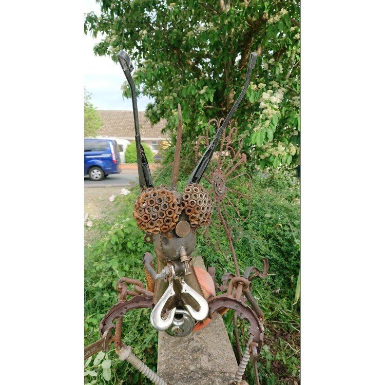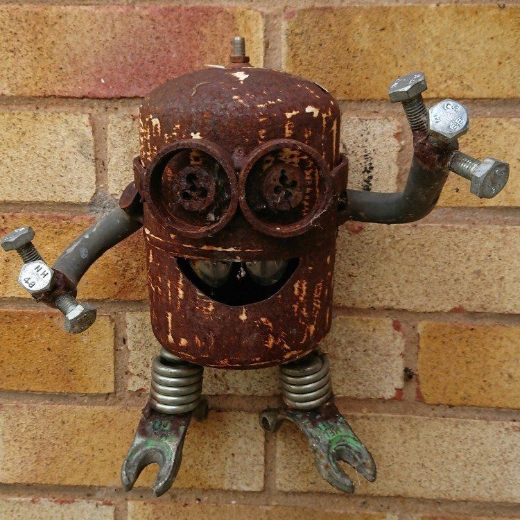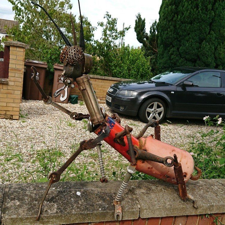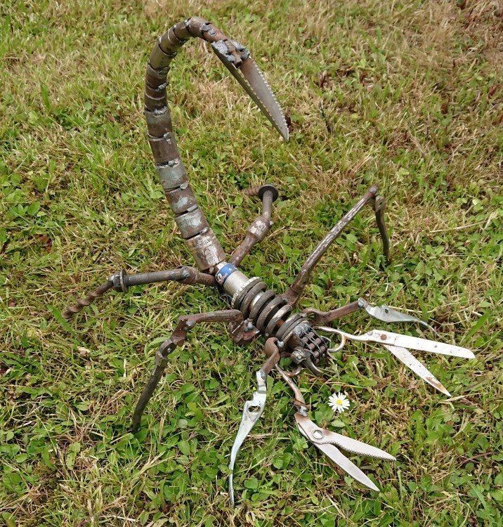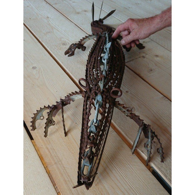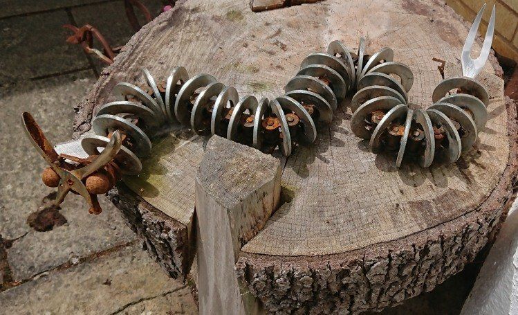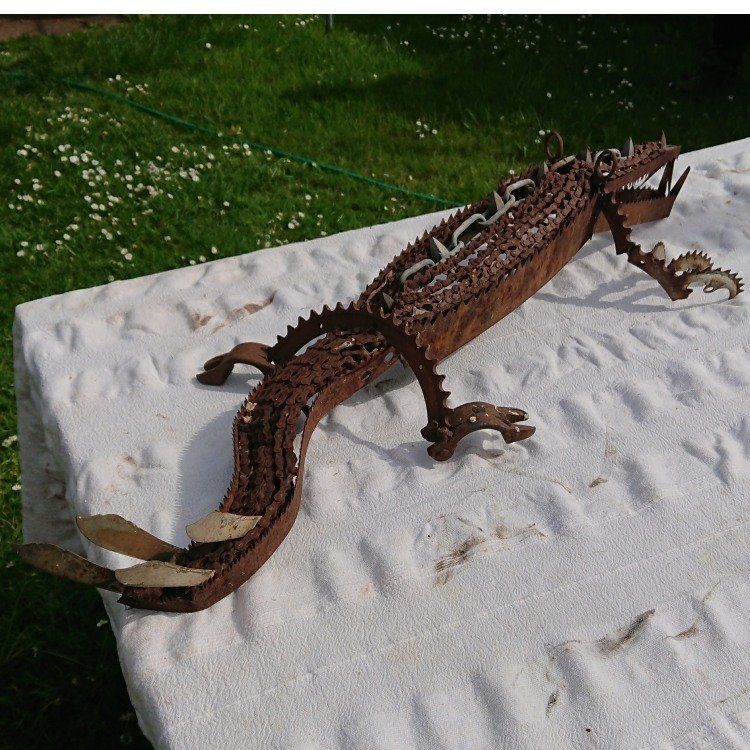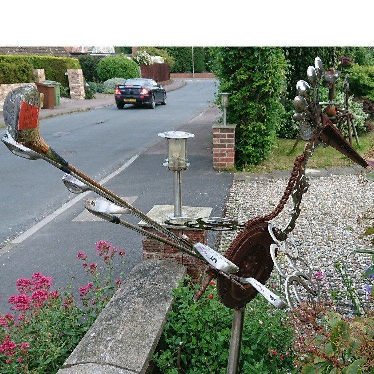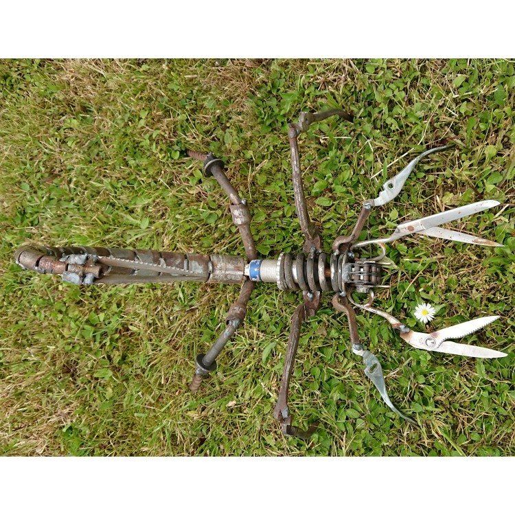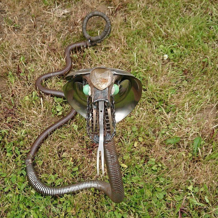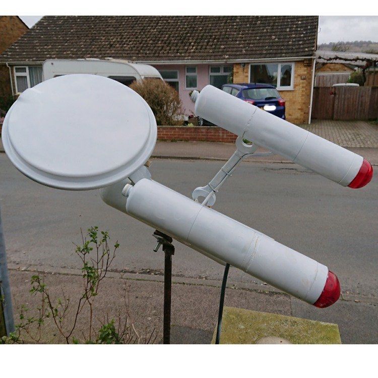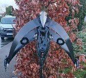 What else should sit oppose the Enterprise as driveway lights? Constructed from Jack saw blades to get the curved wings. The light is an old fashioned bicycle headlamp but with an LED light fitted.