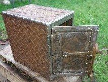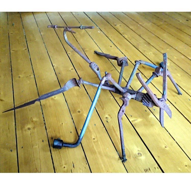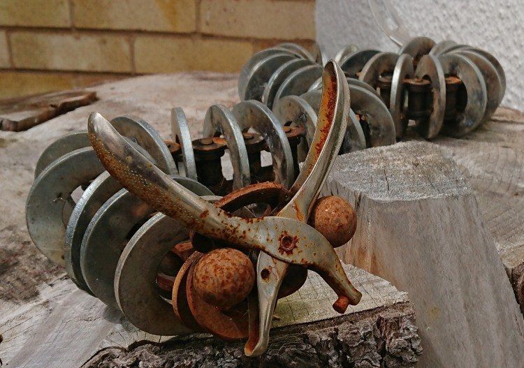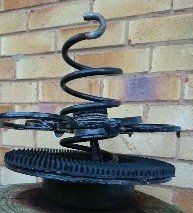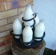 We decided to have milk delivered so we needed a milk bottle holder. Luckily, I had a brake disc, suspension spring, horseshoes and a piston to hand. I decided to cushion the glass against the metal but using car mats.